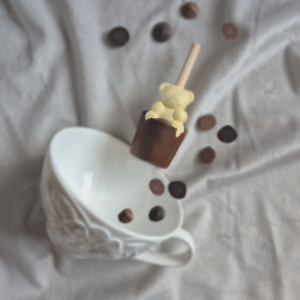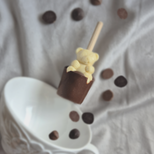 Lizak czekoladowy w kształcie misia. Czekolada mleczna, biała, deserowa.