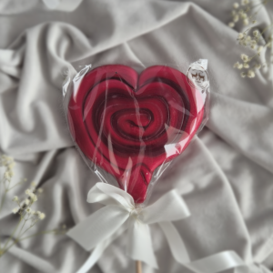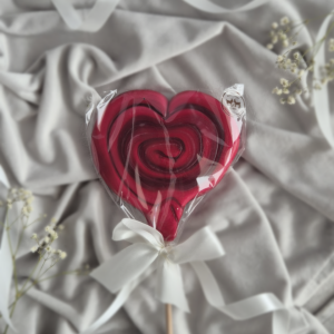Ręcznie wykonany lizak z karmelu w kształcie czerwonego serca. Klasyczny karmelowy smak i efektowny wygląd sprawiają, że to idealny drobny upominek oraz słodki dodatek do prezentów i sesji specjalnych.