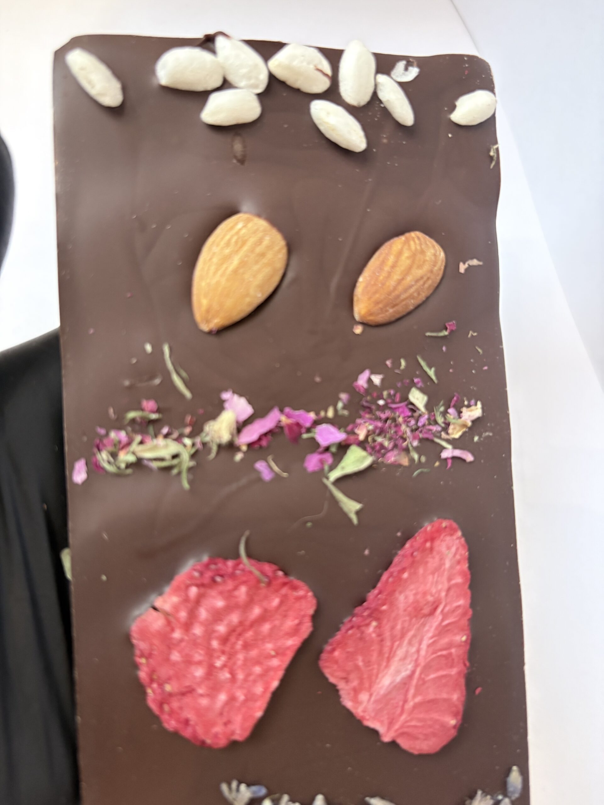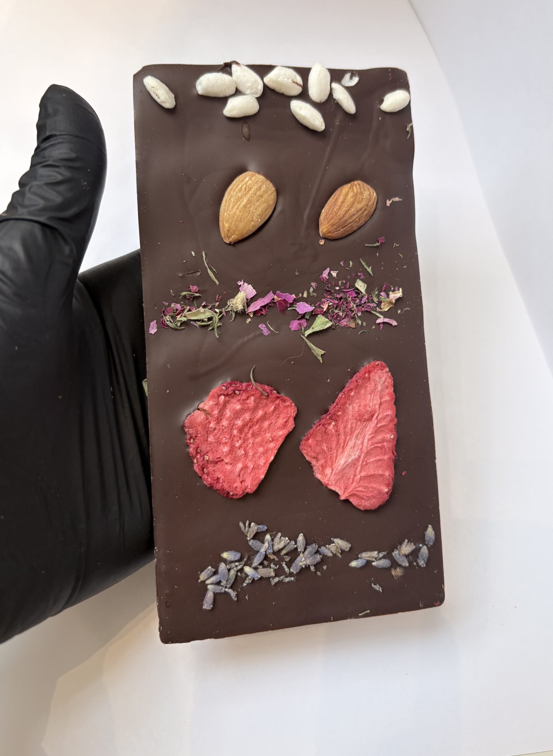Składniki: miazga kakaowa, cukier, tłuszcz kakaowy, emulgator: lecytyna sojowa, naturalny aromat waniliowy, emulgator: E476, dodatki: orzechy, suszone płatki róży, lawendy, liofilizowana truskawka, kruszone ziarno kakaowca.