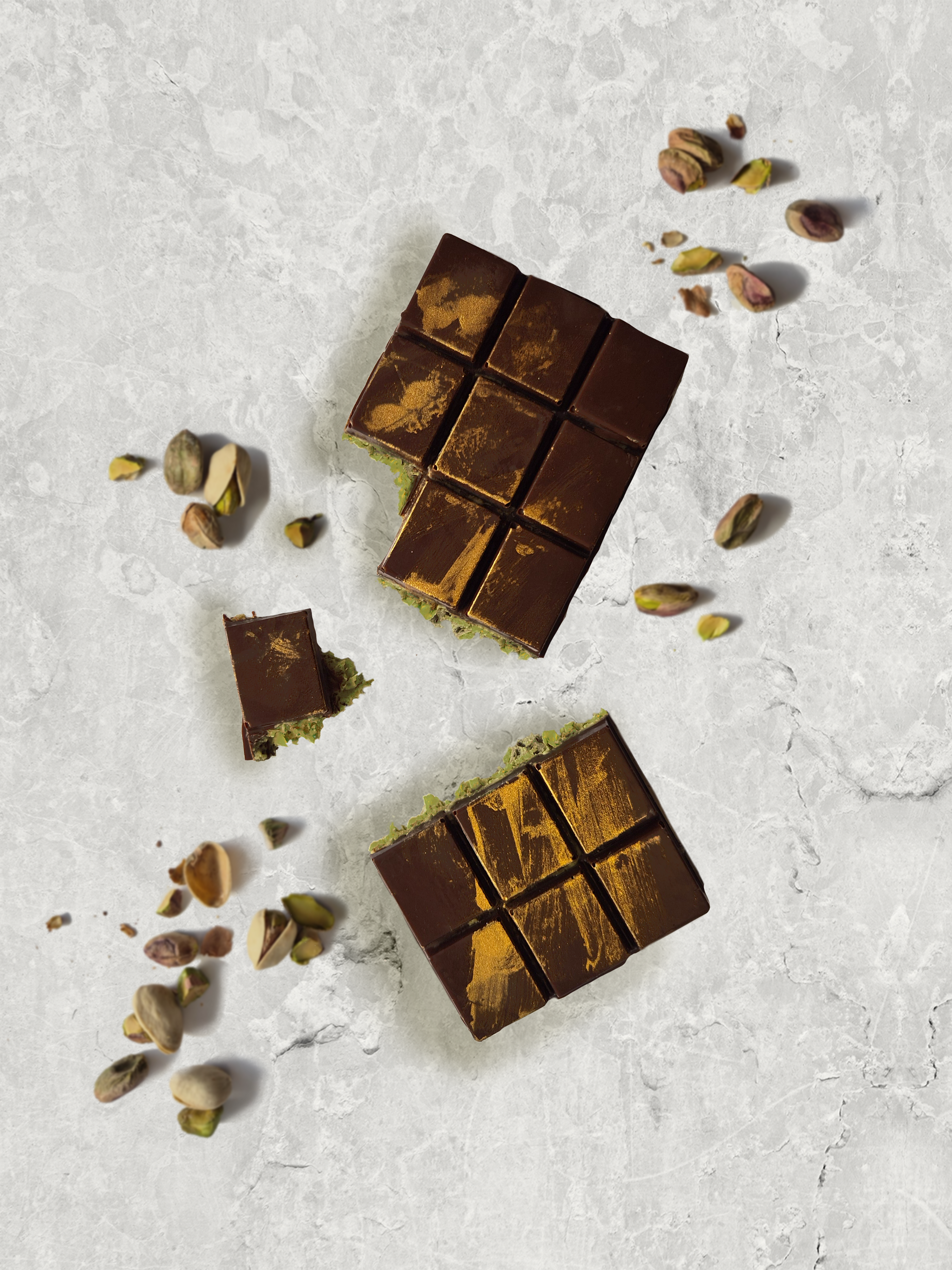 Czekolada Dubaj to połączenie czekolady belgijskiej z kremem pistacjowym oraz ciastem Kataifi .