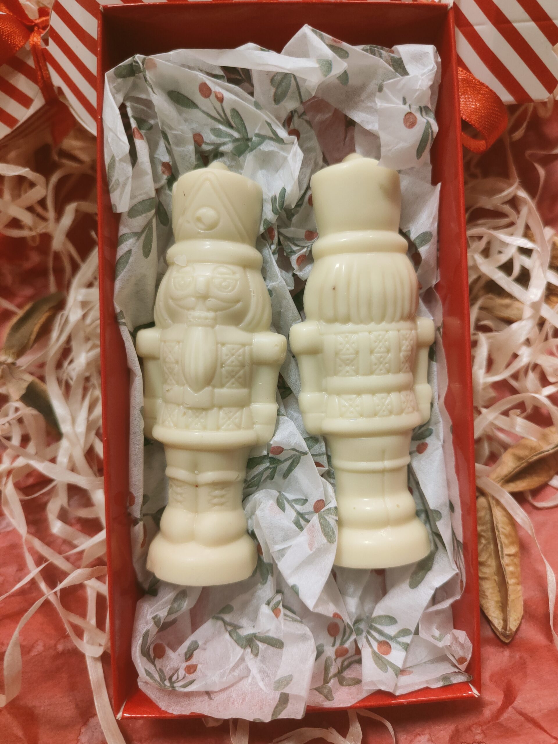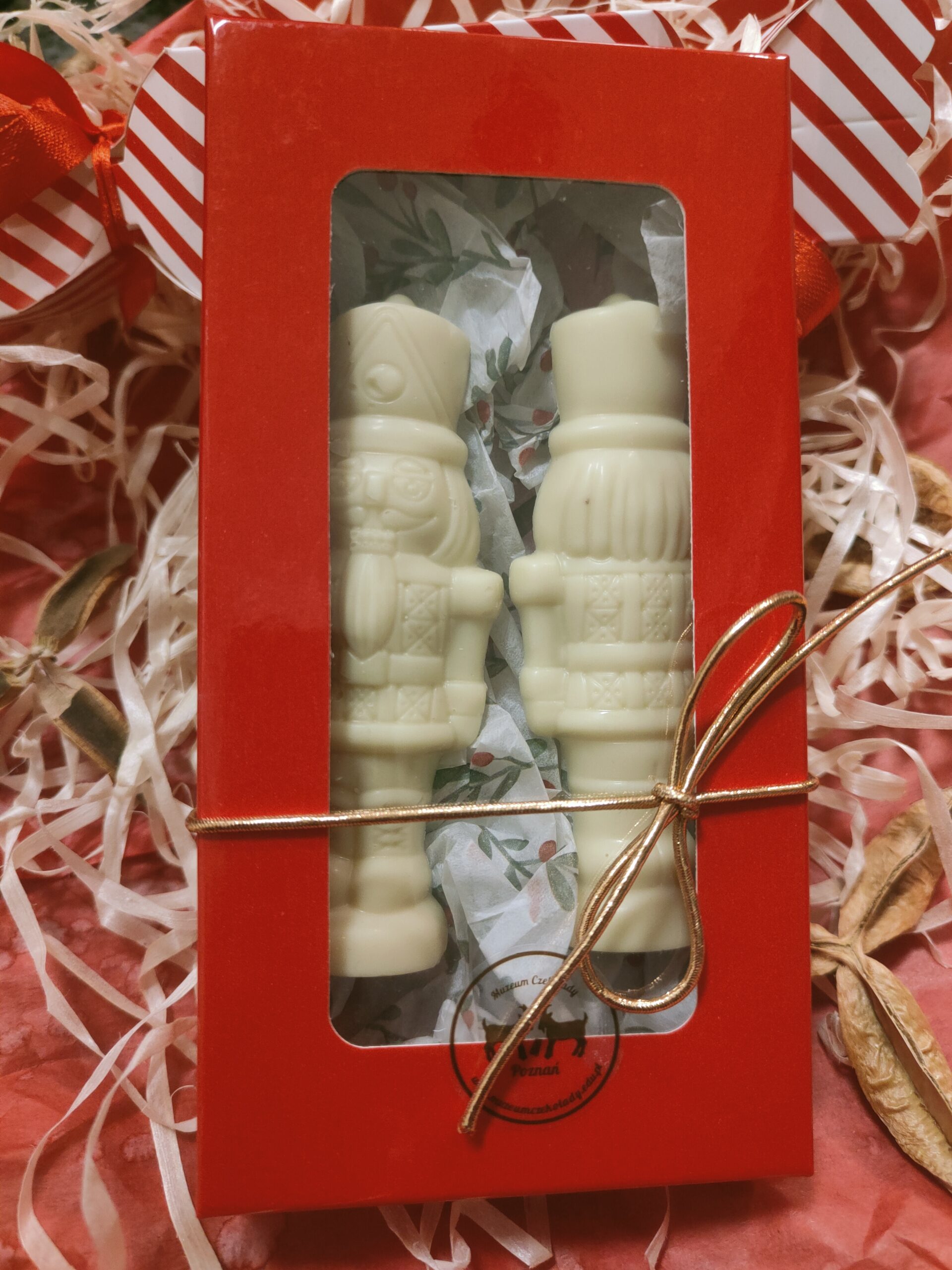 Czekolada belgijska biała – Składniki: cukier, masło kakaowe, pełne mleko w proszku, emulgator: lecytyna (z soi), naturalna wanilia. Czekolada biała: masa kakaowa minimum 33%. Może zawierać orzechy i mleko.