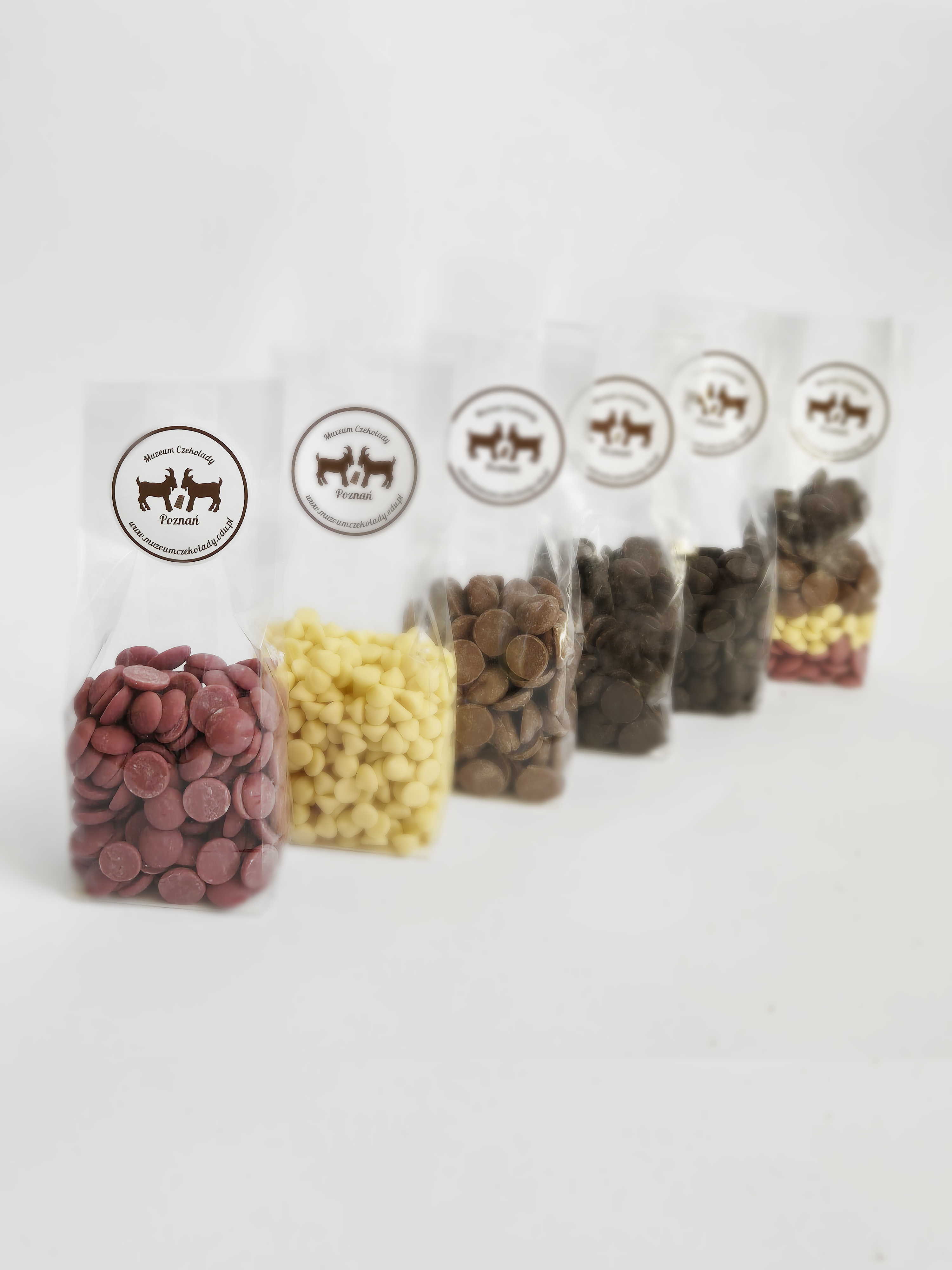 Czekoladki 100 g pakowane są w woreczki celofanowe, 180 g w torebki brązowe doypacki z okienkiem