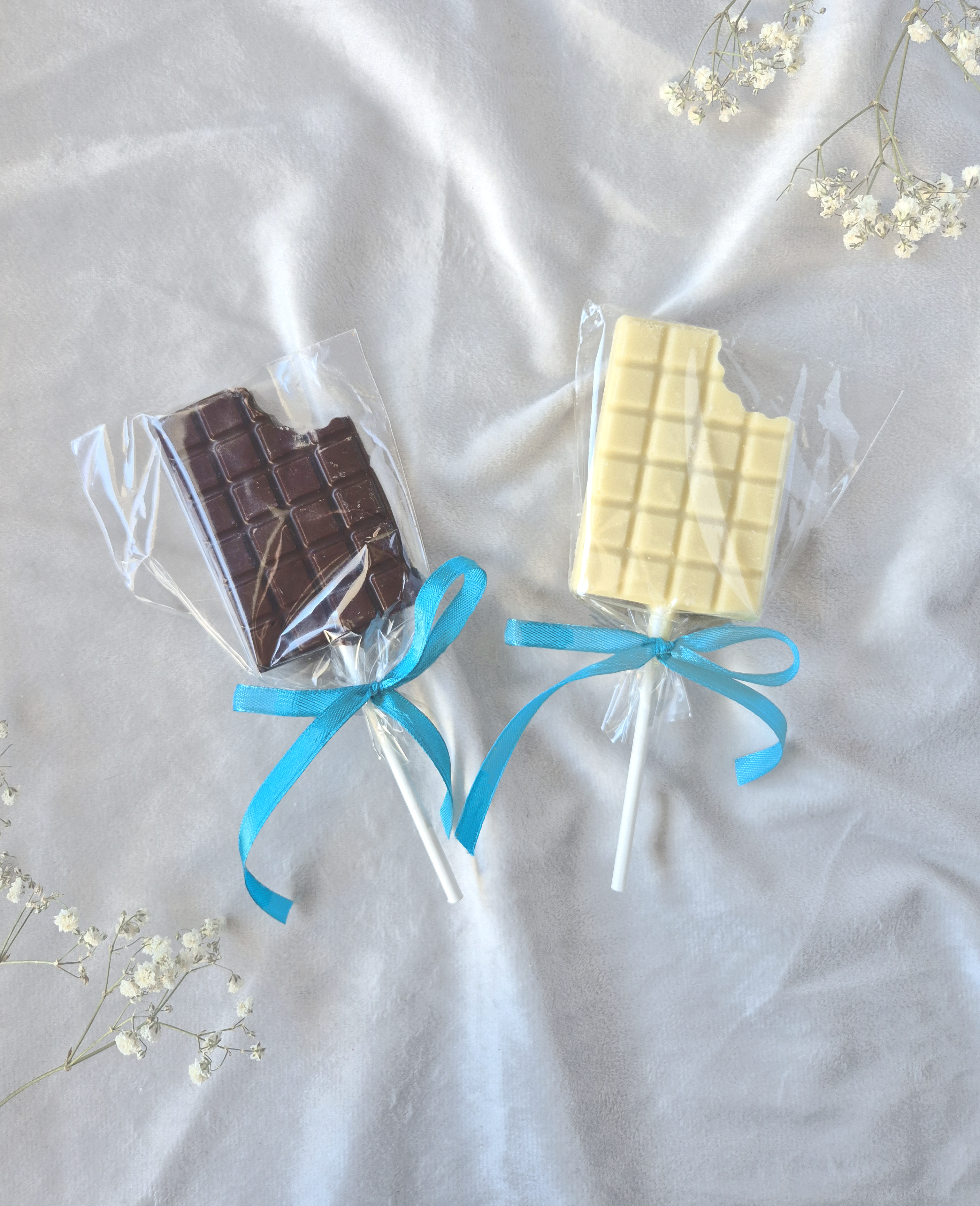 Do wyboru Lizak z czekolady deserowej, mlecznej, rubinowej lub białej.