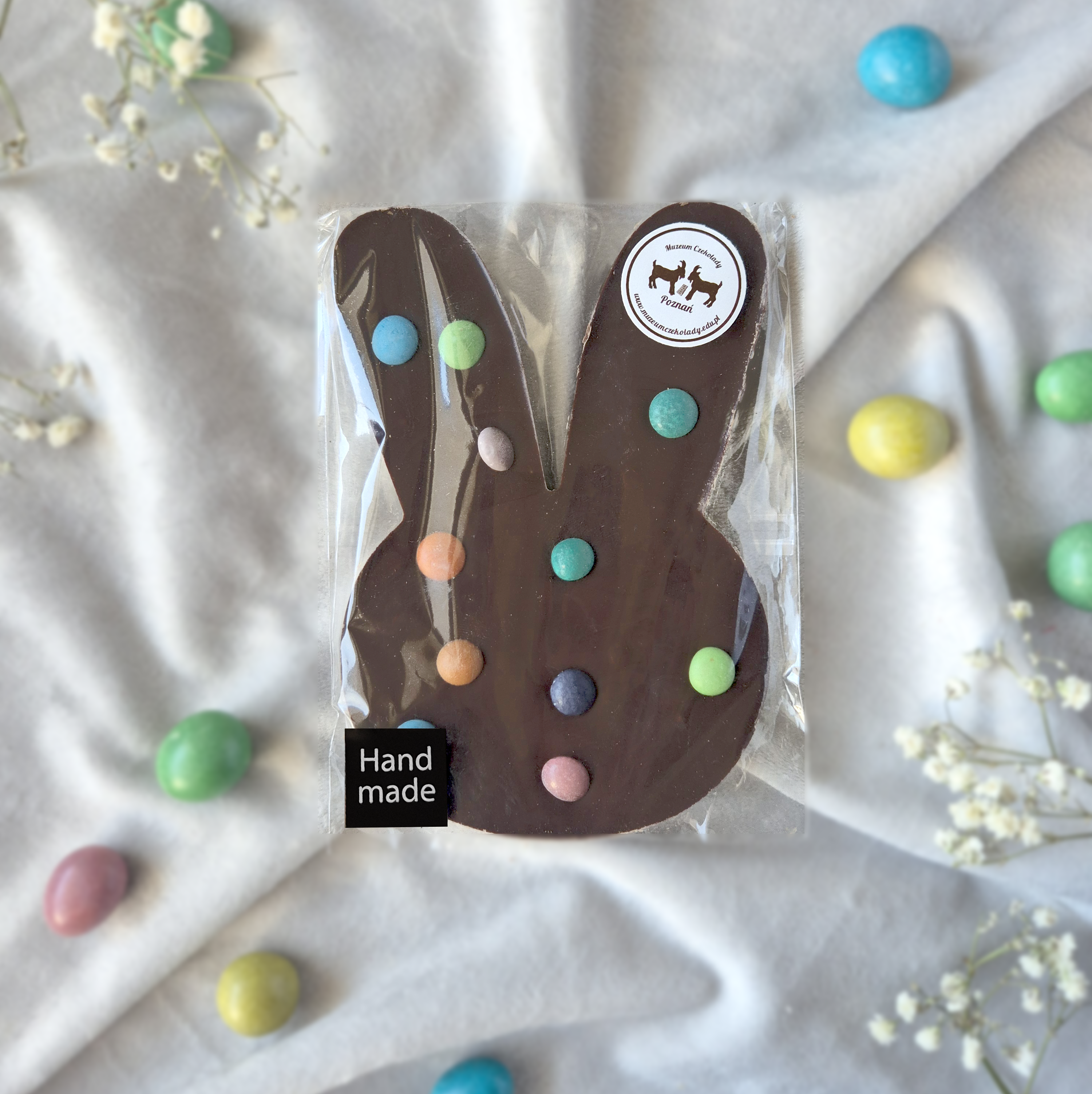 Uszaty zajączek z czekolady mlecznej lub deserowej ozdobiony lentilkami. Całość zapakowana w woreczek ozdobny